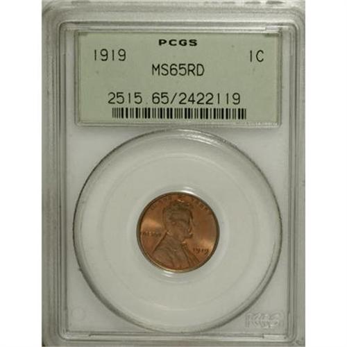 <B>1919 1C MS65 Red PCGS.</B></I> PCGS Population (341/278). NGC Census: (124/79). Mintage: 392,020,992. Numismedia Wsl. Price for NGC/PCGS coin in MS65: $105. (#2515)<BR><BR><B>Coin Engraver:</B> Victor D. Brenner<BR><BR><b>Shipping:</b> Coins & Currency (<a target="_blank" href="http://www.heritageauctions.com/common/shipping.php">view shipping information</a>)