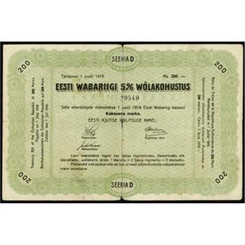 <style type="text/css"> body, td, th { font-family: Arial, Helvetica, sans-serif; font-size: 12px; color: #482424; margin: 0px; padding: 0px; } #header { background-image: url(http://www.bowersandmerena.com/ebay/images/template_v3_01.gif); clear: both; background-color: #590303; border-top-width: 2px; border-top-style: solid; border-top-color: #B38C4F; } #header #header_wrapper { height: 75px; clear: both; width: 800px; margin-right: auto; margin-left: auto; background-image: url(http://www.bowersandmerena.com/ebay/images/template_v3_03.gif); background-repeat: no-repeat; background-position: right; color: #F3EDCC; } #header #header_wrapper #header_logo { float: left; height: 75px; width: 444px; background-image: url(http://www.bowersandmerena.com/ebay/images/template_v3_02.gif); background-repeat: no-repeat; font-size: 10px; text-transform: capitalize; color: #B38C4F; } #header #header_wrapper #header_right { float: left; height: 75px; width: 356px; text-align: right; } #header #header_wrapper #header_right #headerLoginBtn { margin-bottom: 30px; } #header #header_wrapper #header_right input#txtSearch { color: #B49056; border: 1px solid #B49056; width: 175px; padding-top: 3px; padding-right: 3px; padding-bottom: 4px; padding-left: 3px; } #nav { height: 37px; background-image: url(http://www.bowersandmerena.com/ebay/images/template_v3_05.gif); clear: both; } #nav #nav_wrapper { height: 35px; width: 800px; margin-right: auto; margin-left: auto; border-left-width: 1px; border-left-style: solid; border-left-color: #B38C4F; } #nav #nav_wrapper a { padding-right: 15px; padding-left: 15px; border-right-width: 1px; border-right-style: solid; border-right-color: #B38C4F; height: 25px; padding-top: 10px; display: block; float: left; text-decoration: none; font-weight: bold; color: #5D0303; } #nav #nav_wrapper a:hover { color: #B38C4F; } #nav #nav_wrapper #search { float: right; padding-top: 7px; } #nav #nav_wrapper #search #txtSearch { font-family: Arial, Helvetica, sans-serif; font-size: 10px; text-transform: uppercase; color: #D2AE75; border: 1px solid #B38C4F; padding: 3px; } #content_bgd { background-image: url(http://www.bowersandmerena.com/ebay/images/template_v3_09.gif); background-repeat: repeat-y; background-position: center; padding-top: 15px; padding-bottom: 15px; background-color: #FBFBDB; } #content_wrapper { clear: both; height: auto; width: 800px; margin-right: auto; margin-left: auto; } .LotDetailWhite { line-height:normal; font-size:13px; font-family: arial,helvetica,sans-serif; color: White; font-weight: bold; } .LotDetailInformation { line-height:normal; font-size: 13px; font-family: arial,helvetica,sans-serif; } .LotDetailMessage { line-height:normal; font-size: 13px; font-family: arial,helvetica,sans-serif; color: red; } } tr.HeaderAuctionTitle td { color: #000000; font-weight: bold; padding: 2px; background-image: url(http://www.bowersandmerena.com/ebay/images/template_v3_05.gif); background-repeat: repeat-x; border-bottom-width: 1px; border-bottom-style: solid; border-bottom-color: #B38C4F; } table.AuctionSummary a, table.AuctionSummary a:link, table.AuctionSummary a:visited { color: #0000FF; text-decoration: none; } } td.tableHeaderLeft { border-left-width: 1px; border-left-style: solid; border-left-color: #B38C4F; } td.tableHeaderRight { border-right-width: 1px; border-right-style: solid; border-right-color: #B38C4F; } td.tableCellMiddle { border-left-width: 1px; border-left-style: solid; border-left-color: #B38C4F; border-right-width: 1px; border-right-style: solid; border-right-color: #B38C4F; padding: 5px; } tr.footer td { border-top-width: 1px; border-top-style: solid; border-top-color: #B38C4F; } </style> </head> <body> <div id="header"> <div id="header_wrapper"> <div id="header_logo"> </div> <div id="header_right"> </div> </div> </div> <div id="nav"> <div id="nav_wrapper"> <a href="http://www.bowersandmerena.com">Our eBayLive Auctions</a> <a href="#PaymentInfo">Payment Information</a> <a href="#ShippingInfo">Shipping Information</a> <a href="#About">About Bowers and Merena</a> </div> </div> <div id="content_bgd"> <div id="content_wrapper"> <table width="100%" border="0" cellpadding="5" cellspacing="0" class="AuctionSummary"> <tbody> <tr class="HeaderAuctionTitle" style="height: 25px;"> <td align="left" class="tableHeaderLeft" > </td> <td align="center" class="tableHeaderRight"> <span style="font-size: large;">Lot #2679. Estonia. 1919 200 Marka. Republic Debt Obligations of 5% Interest. Series D. Very Fine.</span> </td> </tr> <tr> <td colspan="3" class="tableCellMiddle"> P-17. A great looking note that shows well with nice color and bold overprints. The green inks do a nice job exemplifying the ornate borders. This note also has some split issues which do not detract from the overall appeal.