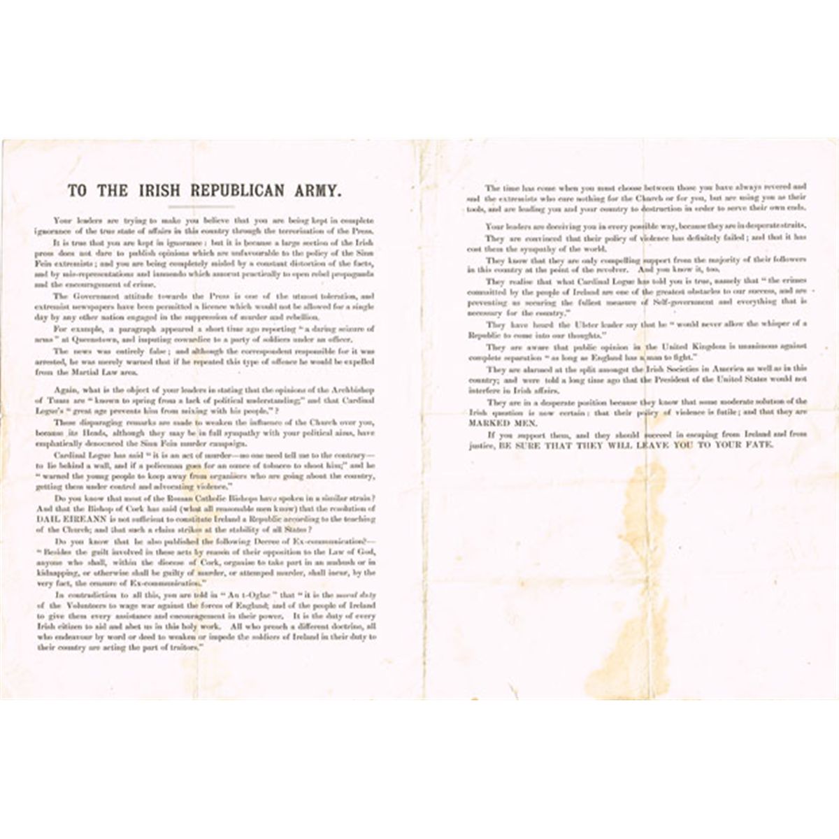 1919-21: Scarce British propaganda leaflet addressed "To the Irish Republican Army" found at Collins Barracks