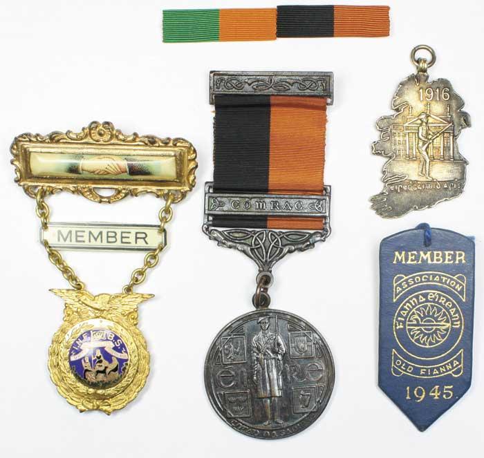 War of Independence medal contained in an official box for the 1916 Rising Medal, also with 1916 "we will rise again" commemorative badge in the shape of the island of Ireland depicting a volunteer outside the GPO, a 1945 members badge for the Old Fianna Éireann Association issued to Andy Dunne, a membership badge of the Irish National Foresters made by the Boston Regalia Company and a ribbon bar for the 1916 Rising Medal and War of Independence Medal. (6 items)