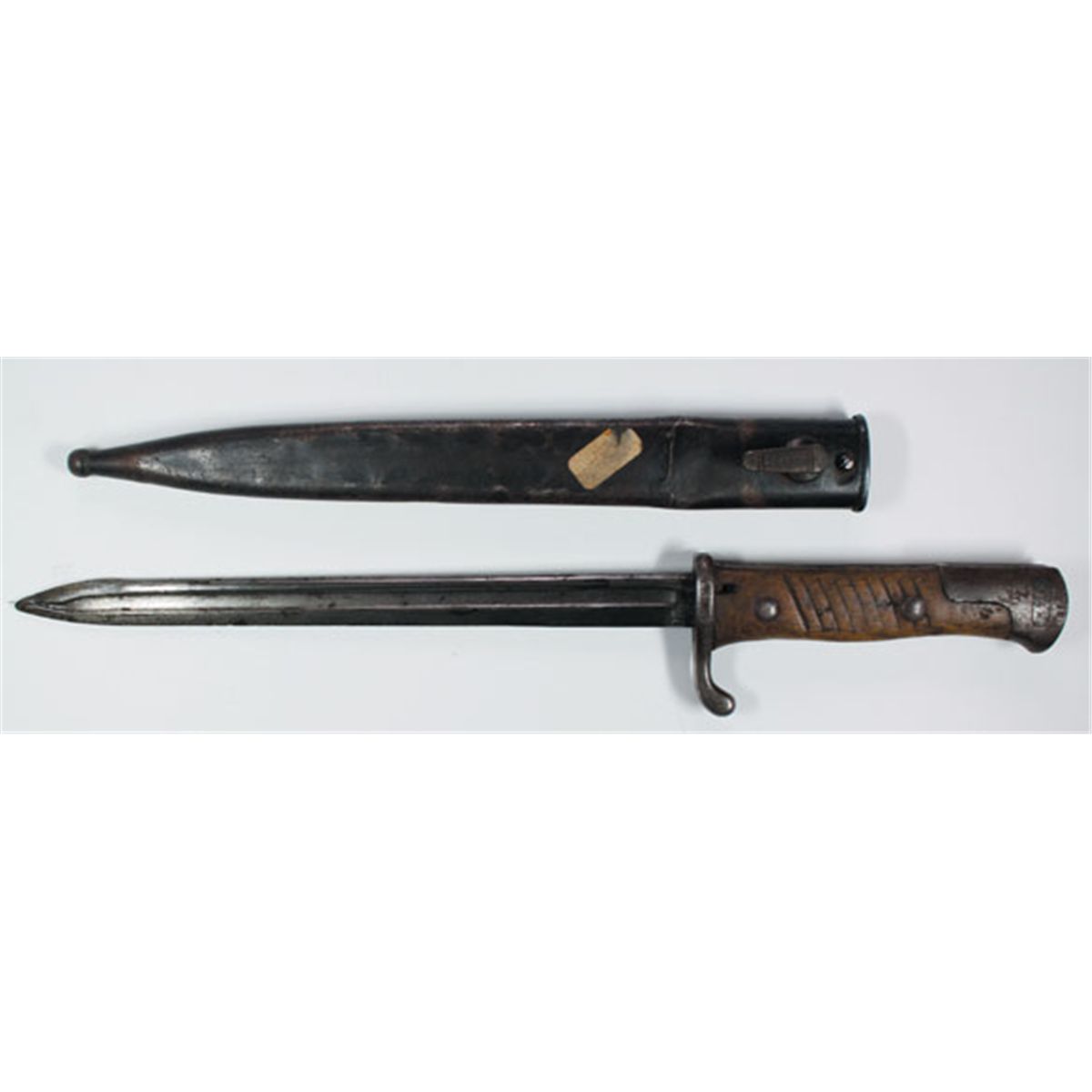 German M1898 bayonet with regimental markings on the cross-guard and crowned factory marks of Erfurt on the blade. The bayonet blade and scabbard cut and shortened, reputedly for use during the War of Independence.