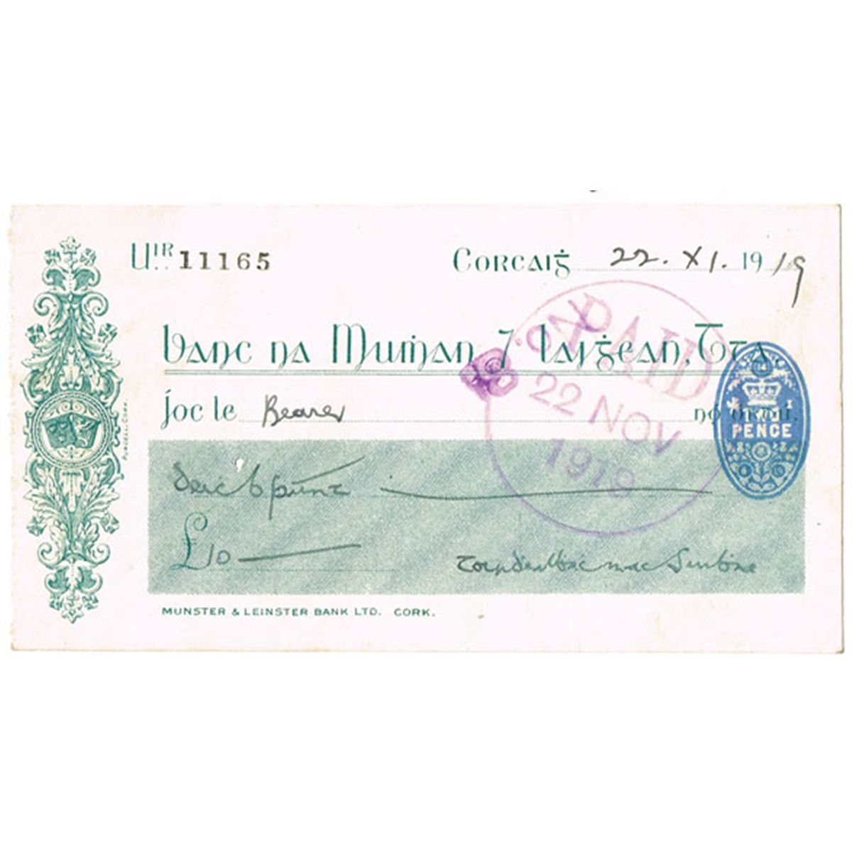 manuscript on Munster and Leinster Irish language cheque
