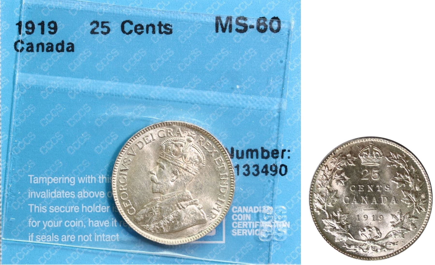 1919 25¢ CCCS Mint State-60 Brilliant and lustrous.