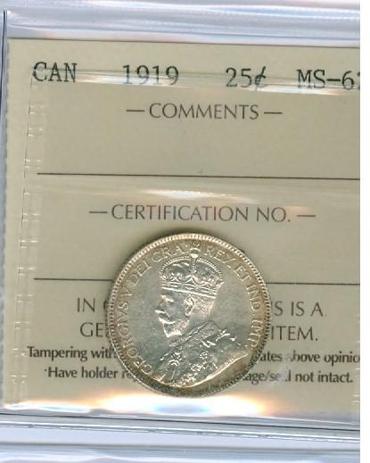 1919 25¢ ICCS MS62. Light golden rim tone with lustre.