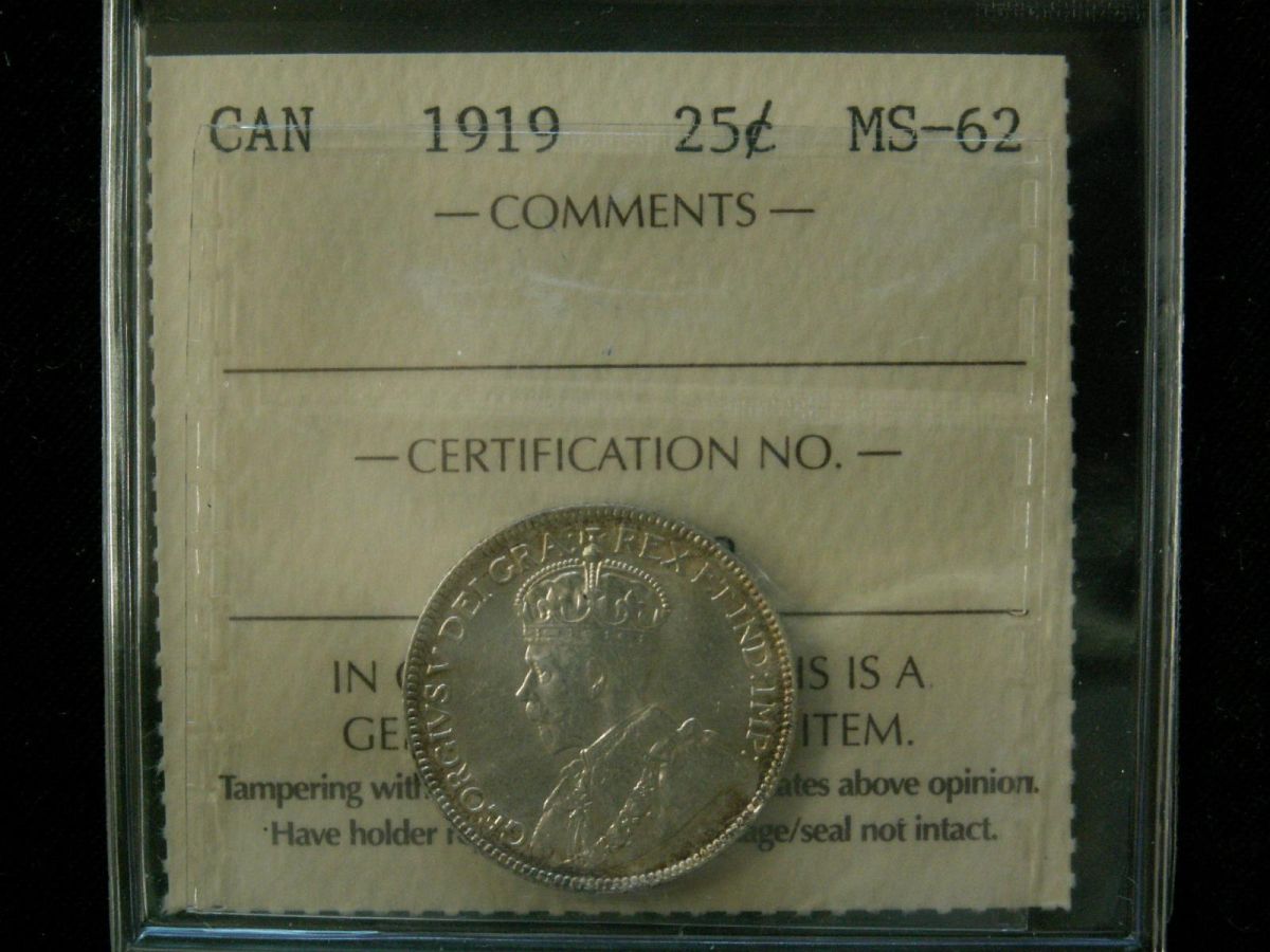 1919 25¢ ICCS MS62. Nice lustre.