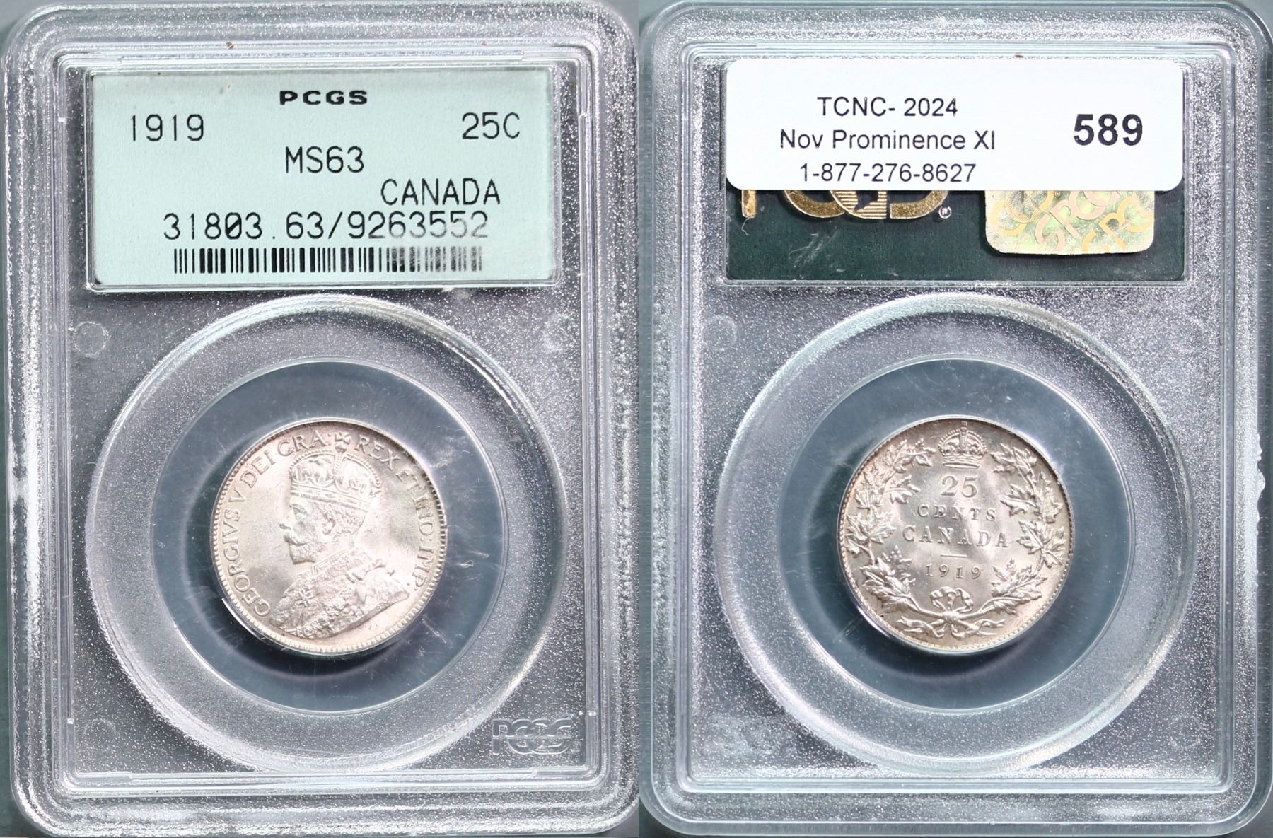 This is an Internet, Live Internet, email, phone and mail auction sale conducted. Information provided by The Canadian Numismatic Company on our web site and in this catalog is strictly AS IS and/or strictly an opinion. No warranty given. Bids are per lot. No lots will be broken. Auction sales are not approval sales. All lots shall be sold to the highest bidder as determined by the auctioneer. If any dispute arises during the sale, the auctioneer has the right to reopen the lot and put it up for sale again. The auctioneer’s decision will be final. In the case of identical (tied) bids during our Live Auctions, the earliest received bid shall take priority. In the case of a tie bid during our Sales, between a mail/fax bid and an Internet bid, the Internet bid will take precedence and obtain the lot. PLEASE CONTACT US IF YOU REQUIRE FURTHER EXPLANATION.