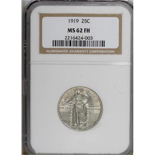 <B>1919 25C MS62 Full Head NGC.</B></I> NGC Census: (30/239). PCGS Population (27/368). Mintage: 11,324,000. Numismedia Wsl. Price for NGC/PCGS coin in MS62: $233. (#5729)<BR><BR><B>Coin Engraver:</B> Hermon A. MacNeil<BR><BR><b>Shipping:</b> Coins & Currency (<a target="_blank" href="http://www.heritageauctions.com/common/shipping.php">view shipping information</a>)
