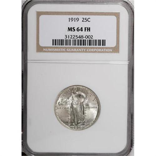 <B>1919 25C MS64 Full Head NGC.</B></I> NGC Census: (87/117). PCGS Population (130/166). Mintage: 11,324,000. Numismedia Wsl. Price for NGC/PCGS coin in MS64: $456. (#5729)<BR><BR><B>Coin Engraver:</B> Hermon A. MacNeil<BR><BR><b>Shipping:</b> Coins & Currency (<a target="_blank" href="http://www.heritageauctions.com/common/shipping.php">view shipping information</a>)