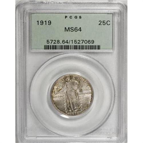 <B>1919 25C MS64 PCGS.</B></I> PCGS Population (178/178). NGC Census: (121/177). Mintage: 11,324,000. Numismedia Wsl. Price for NGC/PCGS coin in MS64: $280. (#5728)<BR><BR><B>Coin Engraver:</B> Hermon A. MacNeil<BR><BR><b>Shipping:</b> Coins & Currency (<a target="_blank" href="http://www.heritageauctions.com/common/shipping.php">view shipping information</a>)