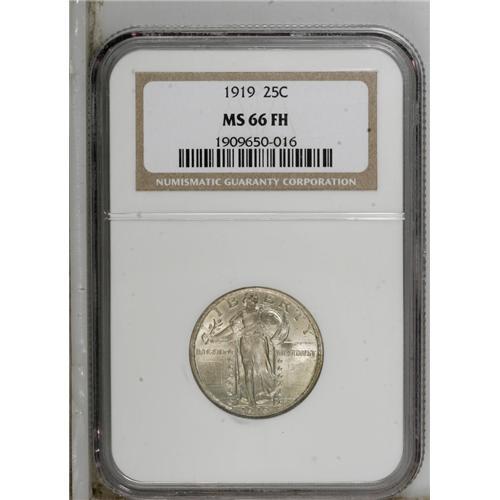 <B>1919 25C MS66 Full Head NGC.</B></I> A sharp strike and full luster are enhanced by light ivory and pale olive toning. In addition to the full head details recorded by NGC, the obverse also has full shield details, including all of the individual rivets. In fact, both sides have detail as sharp as any we have seen.<BR><BR><b>Shipping:</b> Coins & Currency (<a target="_blank" href="http://www.heritageauctions.com/common/shipping.php">view shipping information</a>)