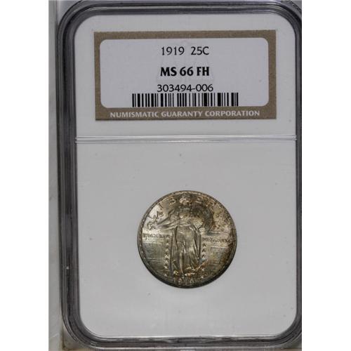 <B>1919<25C> MS66 Full Head NGC.</B></I> The 1919 appears to be a common date, and indeed it is until the upper grade echelons are reached, namely MS66 and higher. With Full Head details, of course, it is rarer yet, even though this issue is probably the best-struck in the series except for the 1917 Type One. The present Premium Gem example offers not only Full Head details, but also full shield stripes and rivets, and excellent definition throughout. There is a light gray-gold patina with a couple of darker areas, melding into russet-copper at the rims. PCGS has graded 10 Full Head examples finer (5/06).