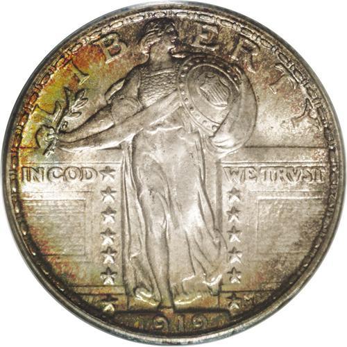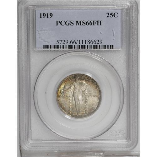 <B>1919<25C> MS66 Full Head PCGS.</B></I> A bold striking with rich multicolored iridescence on the obverse and considerably lighter silver-gray and olive-golden peripheral splashes on the reverse. One of the more available early issues with this combination of strike and surface quality, and a viable type coin candidate as such. Population: 58 in 66, 10 finer (6/06).