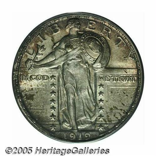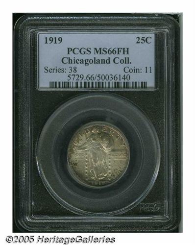 <B>1919<25C> MS66 Full Head PCGS.</B></I> Ex: Chicagoland Collection. This shimmering choice Gem piece has superb strike detail with an unbelievably well struck shield that displays even well defined vertical stripes in the central device. Golden-brown toning border the rims and only add charm to this already magnificent Full Head example. Minimal contact marks contribute to the grade. The eye appeal is impressive. Population: 48 in 66, 10 finer (5/05).