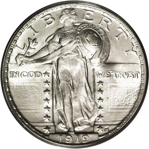 <B>1919<25C> MS66 Full Head PCGS.</B></I> This is a highly desirable Premium Gem with sharp design details in addition to the full head details, which actually are full! All of the shield rivets are completely visible, and even the eagle's breast has feather details. The surfaces are fully brilliant with frosty silver luster. Population: 56 in 66, 10 finer (4/06).