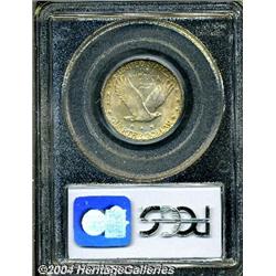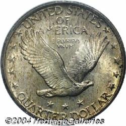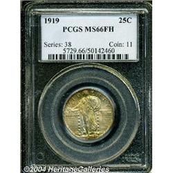 <B>1919<25C> MS66 Full Head PCGS.</B></I> A surprisingly sharply struck Gem that has a razor sharp head and above average details on the waist and shield rivets. Lustrous and nicely preserved with an abundant amount of variegated antique-golden and silver-gray patina. Population: 50 in 66, 10 finer (9/04). <BR><BR><B>Important notice:</B> Heritage usually auctions material at the rate of 200-250 lots per hour. On some occasions eBay Live bid software or the Internet may not be able to keep up with the pace of the auction. We recommend placing a realistic absentee bid now as insurance to avoid disappointment. Occasionally the auctioneer may eliminate or reject an eBay Live bid, and the auctioneer may also reopen a lot after the close of the eBay live bidding (usually because we missed an audience bid), and may reject your bid even if it shows you as the winning bidder. By bidding via eBay Live, you agree that Heritage may award the lot to another bidder at its sole discretion under the circumstances described above or any other reasonable circumstances. Since eBay bids are not shown to us until we open the lot on the floor, we treat those bids just like floor bids. In most cases the floor responds before the eBay bid is presented to us, due to Internet lag time, so for consistency we have made it a policy that floor bids are always considered first over tie eBay live bids. Also please note that all Heritage lots purchased through eBay Live carry a 20% Buyer's Premium. Please make sure you read the Terms and Conditions before you bid.
