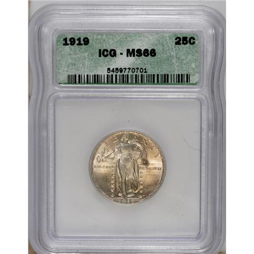 <B>1919 25C MS66 ICG.</B></I> NGC Census: (53/19). PCGS Population (72/12). Mintage: 11,324,000. Numismedia Wsl. Price: $785. (#5728)<BR><BR><b>Shipping:</b> Coins & Currency (<a target="_blank" href="http://www.heritageauctions.com/common/shipping.php">view shipping information</a>)