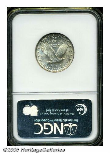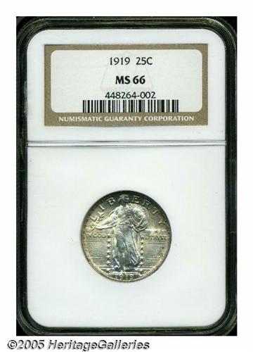 <B>1919<25C> MS66 NGC.</B></I> Fully lustrous surfaces are visited by wisps of lavender at the obverse borders, and freckles of sky-blue and medium gray on the reverse. The design features are exceptionally well struck, with strong (though not full) definition on Liberty's head. There are no significant contact marks to report. Population: 48 in 66, 18 finer (5/05).