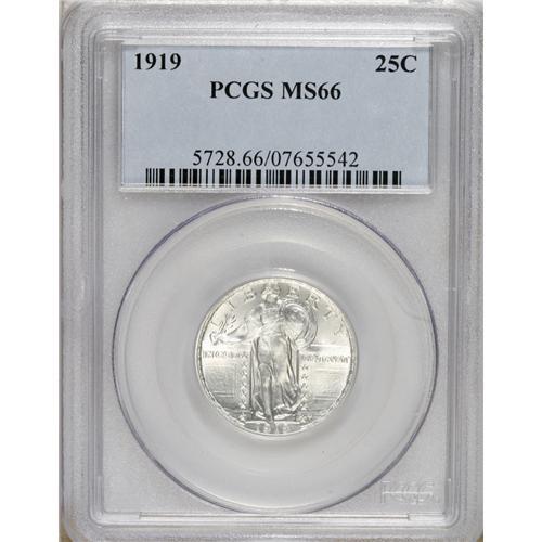 <B>1919 25C MS66 PCGS.</B></I> A lustrous and smooth Premium Gem that has a hint of tan-gold toning. Generally boldly struck, though the sprigs on Liberty's helmet are incomplete. Population: 72 in 66, 12 finer (2/07).<BR><BR><b>Shipping:</b> Coins & Currency (<a target="_blank" href="http://www.heritageauctions.com/common/shipping.php">view shipping information</a>)