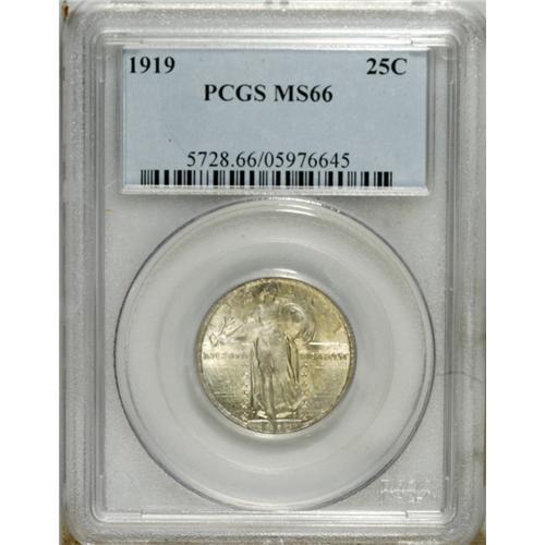 <B>1919 25C MS66 PCGS.</B></I> Pale blue and gold patina graces this highly lustrous and suitably preserved quarter. Well-defined overall, though the shield and head display slight weakness. Population: 69 in 66, 12 finer (1/07).<BR><BR><b>Shipping:</b> Coins & Currency (<a target="_blank" href="http://www.heritageauctions.com/common/shipping.php">view shipping information</a>)