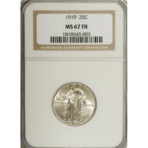 <B>1919 25C MS67 Full Head NGC.</B></I> Few finer examples of this date have been certified by either NGC or PCGS. This Superb Gem is a fully struck piece with incredible obverse and reverse definition. The surfaces are highly lustrous with brilliant silver color that is accented by faint gold toning. This date is actually considered a common one among those issues prior to 1925. Census: 11 in 67, 2 finer (4/07).<BR><I>From The Encinitas Collection.</B></I><BR><BR><b>Shipping:</b> Coins & Currency (<a target="_blank" href="http://www.heritageauctions.com/common/shipping.php">view shipping information</a>)