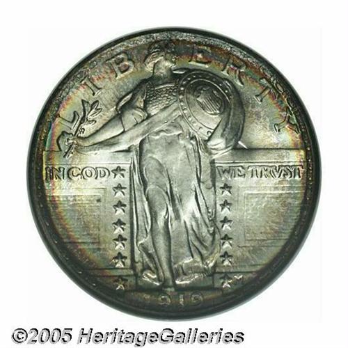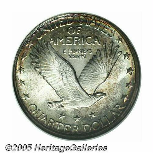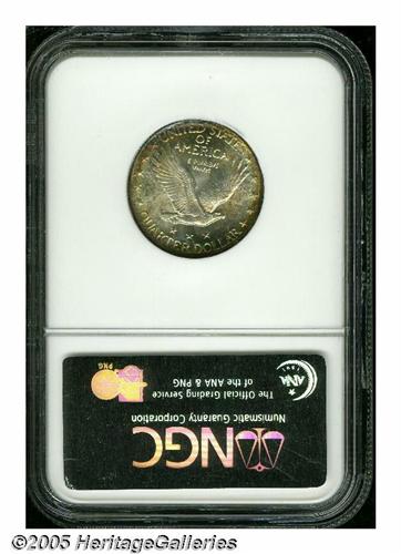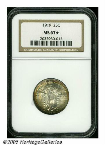<B>1919<25C> MS67 <S NGC.</B></I> An exquisite early Standing Liberty Quarter that comes boldly struck, at least 90 percent full on Liberty's head, and boasts intense, frosty-white centers framed in antique-golden, blue-green, and deep red pastels. <BR><I>From The Clifford Columbus Collection.</B></I>