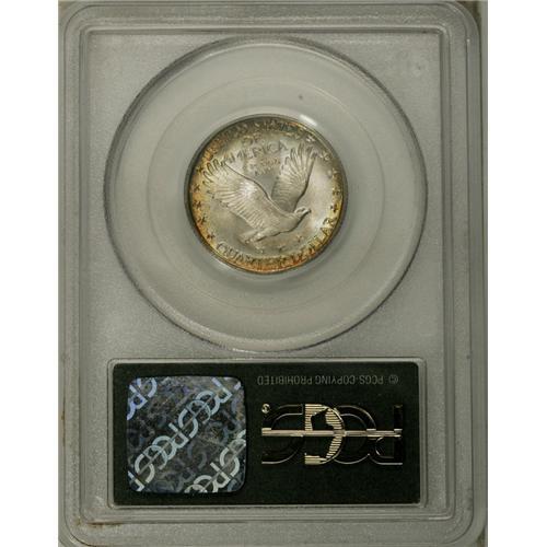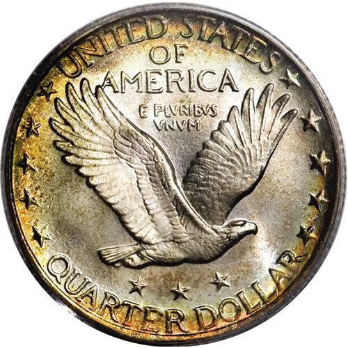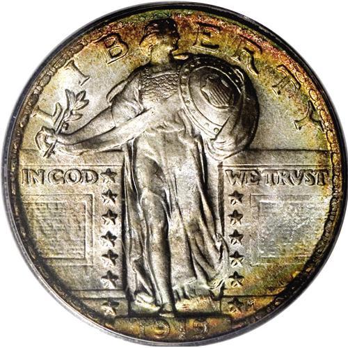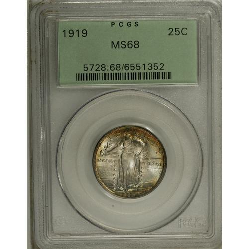 <B>1919 25C MS68 PCGS.</B></I> This P-mint issue boasts the highest mintage of the three 1919-dated deliveries in the Standing Liberty quarter series. Coinage from 1919 has a certain cachet that few other dates from the 20th century possess. In most cases, the Mercury dimes, Standing Liberty quarters, and Walking Liberty half dollars possess lower original mintages than the preceding issues in their respective series. Striking problems also come into play, particularly for the branch mint deliveries. While the 1919-P quarter is not in the same league as the lower mintage 1919-D and 1919-S in terms of strike rarity, it is an eminently collectible issue that is obviously important for date purposes. One would be hard pressed to locate a more visually appealing representative of this issue, even if it did display Full Head detail. A true wonder coin. The luster is full and vibrant, with a swirling frosty sheen. Both sides are peripherally toned in original toning in vivid orange-red hues. With nary a distracting bagmark and a strike that is sharp except on a few isolated highpoints, this coin would grace the finest collection with its presence. Certified in a green-label holder. Population: 2 in 68, 0 finer (11/06).<BR><BR><b>Shipping:</b> Coin/Currency (<a target="_blank" href="http://www.heritageauctions.com/common/shipping.php">view shipping information</a>)