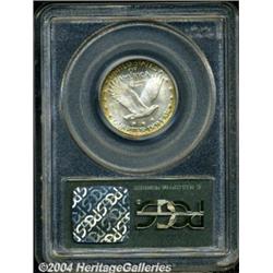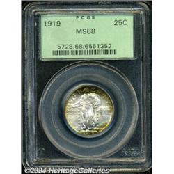 <B>1919<25C> MS68 PCGS.</B></I> This P-mint issue boasts the highest mintage of the three 1919-dated deliveries in the Standing Liberty Quarter series. There seems to be some kind of mystical aura surrounding U.S. silver coinage from 1919. In most cases, the Mercury Dimes, Standing Liberty Quarters, and Walking Liberty Half Dollars possess lower original mintages than the preceding issues in their respective series. Striking problems also come into play, particularly for the branch mint deliveries. While the '19-P Quarter may not be in the same league as the lower mintage 1919-D and 1919-S in terms of strike rarity, it is an eminently collectible issue that is obviously important for date purposes. One would be hard pressed to locate a more visually appealing representative of this issue, even if it did display Full Head detail. A true wonder coin, the luster is both full and vibrant with a swirling frosty sheen. Wholly original, both sides are peripherally toned in vivid orange-red shadings. With nary a distracting bagmark to report, and a strike that is sharp over all but a few isolated highpoints, this coin would grace the finest collection with its presence. Population: 2 in 68, 0 finer (7/04). <BR><BR><B>Important notice:</B> Heritage usually auctions material at the rate of 200-250 lots per hour. On some occasions eBay Live bid software or the Internet may not be able to keep up with the pace of the auction. We recommend placing a realistic absentee bid now as insurance to avoid disappointment. Occasionally the auctioneer may eliminate or reject an eBay Live bid, and the auctioneer may also reopen a lot after the close of the eBay live bidding (usually because we missed an audience bid), and may reject your bid even if it shows you as the winning bidder. By bidding via eBay Live, you agree that Heritage may award the lot to another bidder at its sole discretion under the circumstances described above or any other reasonable circumstances. Since eBay bids are not shown to us until we open the lot on the floor, we treat those bids just like floor bids. In most cases the floor responds before the eBay bid is presented to us, due to Internet lag time, so for consistency we have made it a policy that floor bids are always considered first over tie eBay live bids. Also please note that all Heritage lots purchased through eBay Live carry a 20% Buyer's Premium. Please make sure you read the Terms and Conditions before you bid. </span></font></tr></table></td></tr></table>