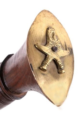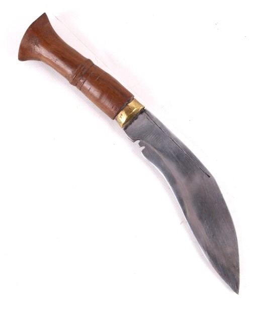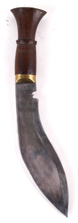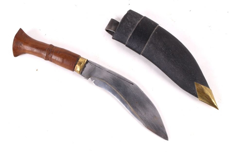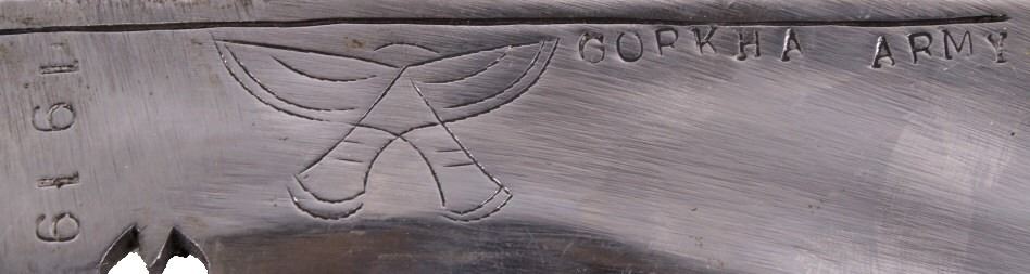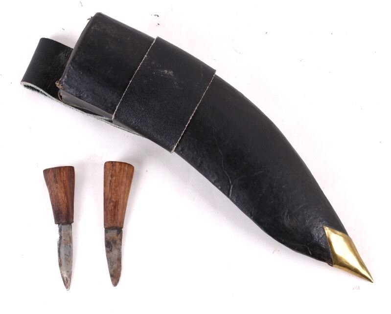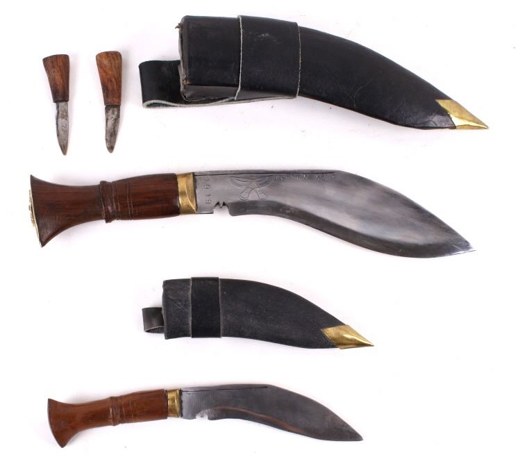 For your bidding pleasure is this 1919 3rd Afghan War Gurkha Army Knife Set. During the Anglo-Nepalese War (1814–16) between the Gorkha Kingdom (present-day Federal Democratic Republic of Nepal) and the East India Company, the Gorkhali soldiers made an impression on the British, who called them Gurkhas. During World War I (1914–1918) more than 200,000 Gurkhas served in the British Army, suffering approximately 20,000 casualties and receiving almost 2,000 gallantry awards. As such, between the World Wars the Gurkha regiments fought in the Third Afghan War in 1919. The regiments then participated in numerous campaigns on the North-West Frontier, mainly in Waziristan, where they were employed as garrison troops defending the frontier. They kept the peace among the local populace and engaged with the lawless and often openly hostile Pathan tribesmen. These blades are matching with the iconic re curve blade, each blade has blood channels starting from the blades halfway point, the larger blade is stamped 1919 with two crossed Gurkha blades and the inscription Gurkha Army. These blades are full tang, with the larger blade having a crossed Gurkha blades pin as the pommel. The larger sheath has two small blades set behind the sheath entry point for the larger blade. The measurements of these blades are for the larger blade 9" long with a 5" re curve. The smaller blade 5 1/2" with a 3 1/4" re curve. Both small blades are 1 3/4" long. Sheathed the length is 15 1/2" and 10 1/2".