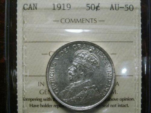 1919 50¢ ICCS AU50, a nice blast white example.