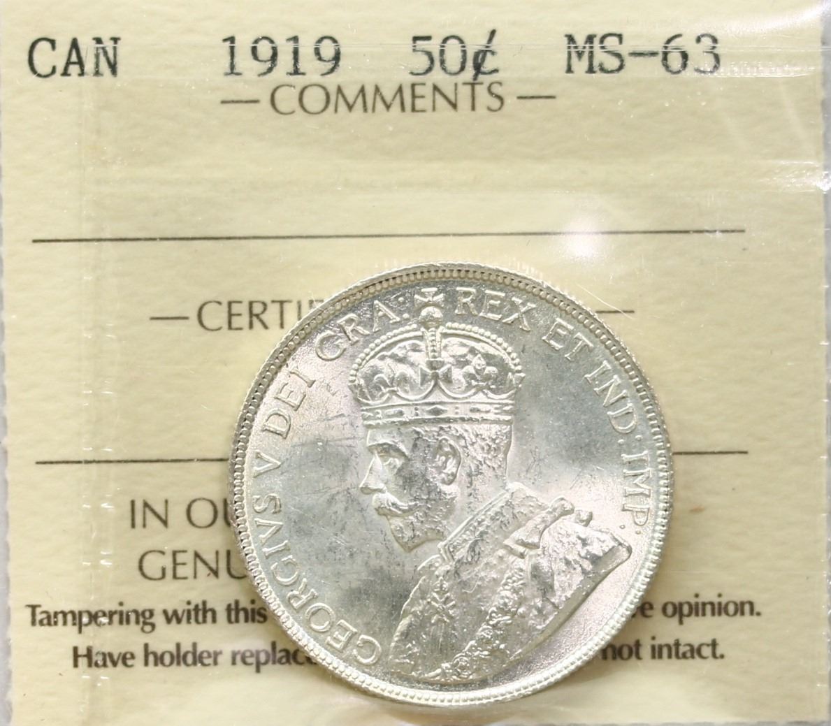 1919 50¢ ICCS Choice Mint State-63. Fully brilliant and lustrous. A very attractive and flashy example.