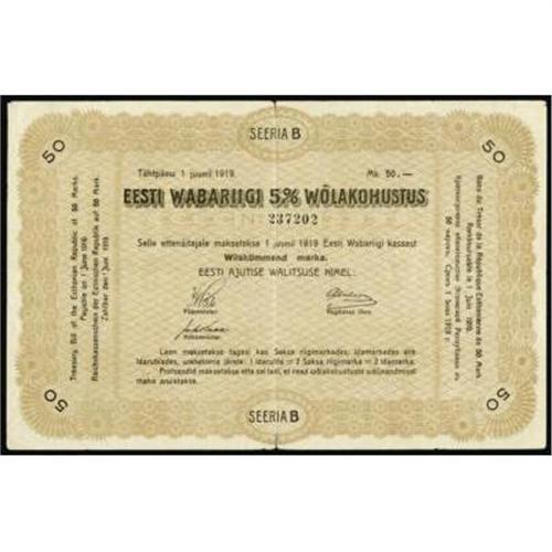 <style type="text/css"> body, td, th { font-family: Arial, Helvetica, sans-serif; font-size: 12px; color: #482424; margin: 0px; padding: 0px; } #header { background-image: url(http://www.bowersandmerena.com/ebay/images/template_v3_01.gif); clear: both; background-color: #590303; border-top-width: 2px; border-top-style: solid; border-top-color: #B38C4F; } #header #header_wrapper { height: 75px; clear: both; width: 800px; margin-right: auto; margin-left: auto; background-image: url(http://www.bowersandmerena.com/ebay/images/template_v3_03.gif); background-repeat: no-repeat; background-position: right; color: #F3EDCC; } #header #header_wrapper #header_logo { float: left; height: 75px; width: 444px; background-image: url(http://www.bowersandmerena.com/ebay/images/template_v3_02.gif); background-repeat: no-repeat; font-size: 10px; text-transform: capitalize; color: #B38C4F; } #header #header_wrapper #header_right { float: left; height: 75px; width: 356px; text-align: right; } #header #header_wrapper #header_right #headerLoginBtn { margin-bottom: 30px; } #header #header_wrapper #header_right input#txtSearch { color: #B49056; border: 1px solid #B49056; width: 175px; padding-top: 3px; padding-right: 3px; padding-bottom: 4px; padding-left: 3px; } #nav { height: 37px; background-image: url(http://www.bowersandmerena.com/ebay/images/template_v3_05.gif); clear: both; } #nav #nav_wrapper { height: 35px; width: 800px; margin-right: auto; margin-left: auto; border-left-width: 1px; border-left-style: solid; border-left-color: #B38C4F; } #nav #nav_wrapper a { padding-right: 15px; padding-left: 15px; border-right-width: 1px; border-right-style: solid; border-right-color: #B38C4F; height: 25px; padding-top: 10px; display: block; float: left; text-decoration: none; font-weight: bold; color: #5D0303; } #nav #nav_wrapper a:hover { color: #B38C4F; } #nav #nav_wrapper #search { float: right; padding-top: 7px; } #nav #nav_wrapper #search #txtSearch { font-family: Arial, Helvetica, sans-serif; font-size: 10px; text-transform: uppercase; color: #D2AE75; border: 1px solid #B38C4F; padding: 3px; } #content_bgd { background-image: url(http://www.bowersandmerena.com/ebay/images/template_v3_09.gif); background-repeat: repeat-y; background-position: center; padding-top: 15px; padding-bottom: 15px; background-color: #FBFBDB; } #content_wrapper { clear: both; height: auto; width: 800px; margin-right: auto; margin-left: auto; } .LotDetailWhite { line-height:normal; font-size:13px; font-family: arial,helvetica,sans-serif; color: White; font-weight: bold; } .LotDetailInformation { line-height:normal; font-size: 13px; font-family: arial,helvetica,sans-serif; } .LotDetailMessage { line-height:normal; font-size: 13px; font-family: arial,helvetica,sans-serif; color: red; } } tr.HeaderAuctionTitle td { color: #000000; font-weight: bold; padding: 2px; background-image: url(http://www.bowersandmerena.com/ebay/images/template_v3_05.gif); background-repeat: repeat-x; border-bottom-width: 1px; border-bottom-style: solid; border-bottom-color: #B38C4F; } table.AuctionSummary a, table.AuctionSummary a:link, table.AuctionSummary a:visited { color: #0000FF; text-decoration: none; } } td.tableHeaderLeft { border-left-width: 1px; border-left-style: solid; border-left-color: #B38C4F; } td.tableHeaderRight { border-right-width: 1px; border-right-style: solid; border-right-color: #B38C4F; } td.tableCellMiddle { border-left-width: 1px; border-left-style: solid; border-left-color: #B38C4F; border-right-width: 1px; border-right-style: solid; border-right-color: #B38C4F; padding: 5px; } tr.footer td { border-top-width: 1px; border-top-style: solid; border-top-color: #B38C4F; } </style> </head> <body> <div id="header"> <div id="header_wrapper"> <div id="header_logo"> </div> <div id="header_right"> </div> </div> </div> <div id="nav"> <div id="nav_wrapper"> <a href="http://www.bowersandmerena.com">Our eBayLive Auctions</a> <a href="#PaymentInfo">Payment Information</a> <a href="#ShippingInfo">Shipping Information</a> <a href="#About">About Bowers and Merena</a> </div> </div> <div id="content_bgd"> <div id="content_wrapper"> <table width="100%" border="0" cellpadding="5" cellspacing="0" class="AuctionSummary"> <tbody> <tr class="HeaderAuctionTitle" style="height: 25px;"> <td align="left" class="tableHeaderLeft" > </td> <td align="center" class="tableHeaderRight"> <span style="font-size: large;">Lot #2675. Estonia. 1919 50 Marka. Republic Debt Obligations of 5% Interest. XF/AU.</span> </td> </tr> <tr> <td colspan="3" class="tableCellMiddle"> P-7. This interesting issue spans many years and contains a vast variety of notes. This 1919 50 Marka note exhibits superb paper with only a small corner, center, and horizontal fold present. This note may well be the finest known and looks terrific. The common small split at the top center and bottom center margin are present which we note for accuracy.