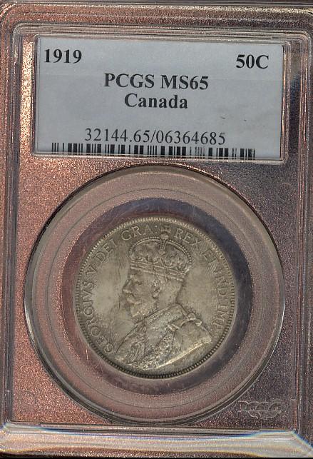 1919 50¢ PCGS MS65PQ, intense autumn shades over full underlying luster. Scarce in this condition.