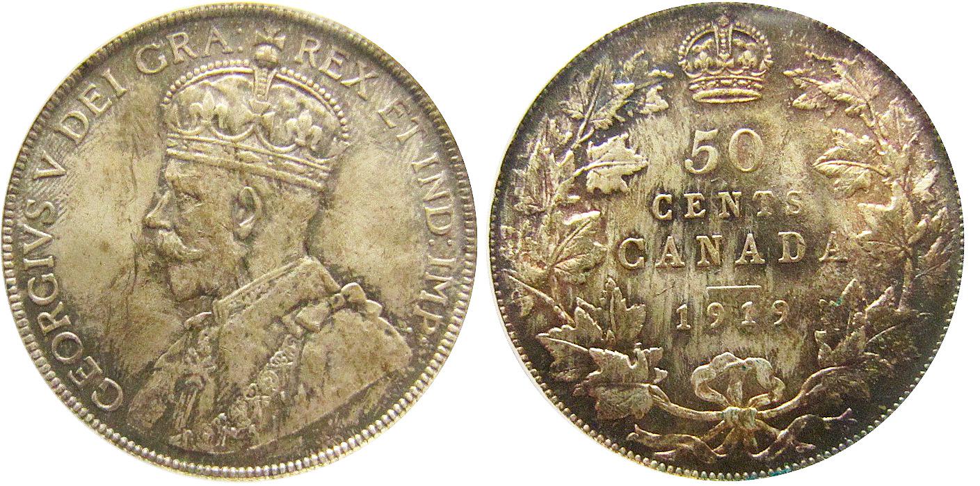 1919 50¢ PCGS MS65PQ, intense autumn shades over full underlying luster. Scarce in this condition.