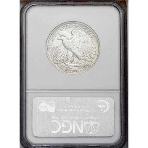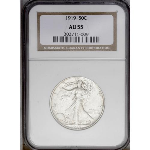 <B>1919<50C> AU55 NGC.</B></I> An untoned silver-gray example of this scarce date. Typically struck with noticeable highpoint wear but only a handful of tiny abrasions on either side. The 1919-P is the least rare of the three halves from that year, yet it remains a popular (and truly scarce) coin because of its mintage of fewer than a million pieces.