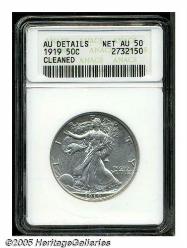 <B>1919<50C>--Cleaned--ANACS. AU Details, Net AU50.</B></I> A lightly worn example that has a few faint contact marks on each side. Many observers would not notice that this coin has been cleaned. Less than 1 million pieces were struck.