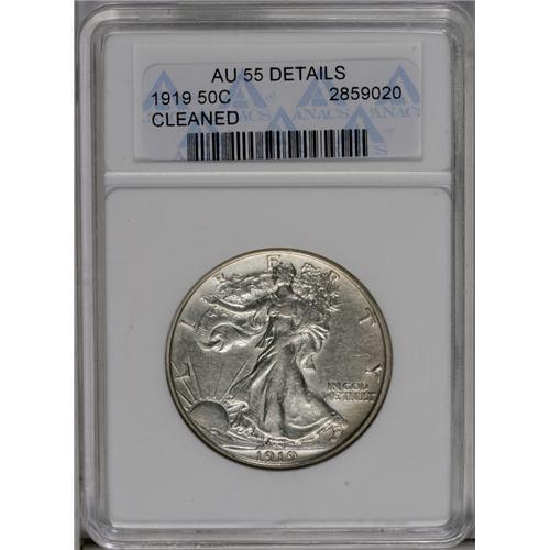 <B>1919<50C>--Cleaned--ANACS. AU55 Details.</B></I> Luster glimmers from the major devices, although this ivory-gray example is subdued by a mild cleaning. As was also the case in 1921, the Philadelphia Mint issue has the lowest mintage of the year, but was better saved in high grades.