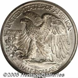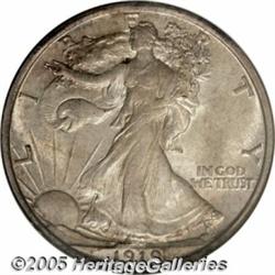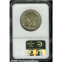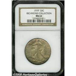 <B>1919 50C MS63 NGC.</B></I> Ex: Richmond Collection. Among Philadelphia Mint issues, only the 1916 and 1921 possess lower productions than the 1919, of which 962,000 pieces were struck. As such, it is a desirable and elusive date as far as early Walkers are concerned. In his book <I>The Complete Guide to Walking Liberty Half Dollars,</B></I> Fox assigns an R4 Rating ("Scarce. May or may not be available at larger shows") to MS63 Walking Liberty 1919 Philadelphia coins. The surfaces of this example reveal nice luster, and are well preserved, showing only three or four minute, well concealed marks on Liberty's figure. Warm olive-tan patina with a splash or two of ice-blue color occupies each side. While not fully struck, as is the case with many early-date Walkers, the design elements display better-than-average definition. Liberty's head shows very nice detail, and the left thumb area is partially defined. Most all of the feathers show on the eagle. Indeed, some might consider this piece to be conservatively graded.