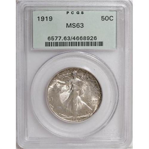 <B>1919 50C MS63 PCGS.</B></I> Though its D-mint counterpart overshadows this issue in Mint State grades, the 1919 half is challenging in its own right. Light gold-gray patina graces much of this shimmering P-mint piece, while dappled blue-gray toning appears at the upper obverse periphery. A delightful Select example from this early issue, housed in a green label holder.<BR><BR><b>Shipping:</b> Coins & Currency (<a target="_blank" href="http://www.heritageauctions.com/common/shipping.php">view shipping information</a>)