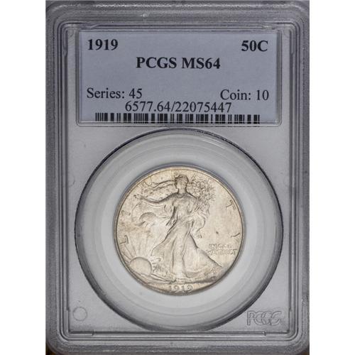 <B>1919<50C> MS64 PCGS.</B></I> Lightly subdued radiance, with boldly defined central devices and nearly unmarked fields. An appealing example of this challenging Philadelphia Mint Walker, one of the few issues in the series with a mintage of less than one million pieces. Population: 93 in 64, 73 finer (3/06). <BR><BR><B>Important notice:</B> Heritage usually auctions material at the rate of 200-250 lots per hour. On some occasions eBay Live bid software or the Internet may not be able to keep up with the pace of the auction. We recommend placing a realistic absentee bid now as insurance to avoid disappointment. Occasionally the auctioneer may eliminate or reject an eBay Live bid, and the auctioneer may also reopen a lot after the close of the eBay live bidding (usually because we missed an audience bid), and may reject your bid even if it shows you as the winning bidder. By bidding via eBay Live, you agree that Heritage may award the lot to another bidder at its sole discretion under the circumstances described above or any other reasonable circumstances. Since eBay bids are not shown to us until we open the lot on the floor, we treat those bids just like floor bids. In most cases the floor responds before the eBay bid is presented to us, due to Internet lag time, so for consistency we have made it a policy that floor bids are always considered first over tie eBay live bids. Also please note that all Heritage lots purchased through eBay Live carry a 20% Buyer's Premium. Please make sure you read the Terms and Conditions before you bid. This lot is being auctioned in conjunction with a live floor auction by Heritage Galleries & Auctioneers. All final auction and invoice information will be supplied by Heritage Galleries & Auctioneers, and all other information should be considered preliminary. Lot:2922 <BR><BR><B>Winning Notification and Billing:</B> After the FINAL session in this auction is complete, Heritage will send e-mail and snail mail invoices. This process normally takes several days. All final auction and invoice information will be supplied by Heritage Galleries & Auctioneers, and all other information should be considered preliminary. <BR><BR>This auction will be conducted on a live auction floor and over the Internet through eBay Live. If you choose to place an absentee bid, please take a moment to <font color='#0000ff'><u><a href='http://pages.ebay.com/liveauctions/help/before/laabsentee.html'>learn how eBay Live absentee bidding works</a></u></font><font color='#000000'>