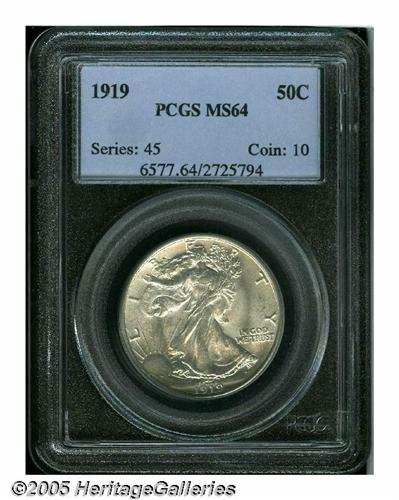 <B>1919<50C> MS64 PCGS.</B></I> The 1919 date carries a certain cachet that few other dates possess from the 20th century. All three issues of the 1919 half dollar are very scarce, and while the P-mint halves have the lowest mintage, they are the most available of the three. This coin is very sharply struck on both sides and has terrific mint luster. The bright, essentially untoned surfaces seem to be very close to Gem quality, with an unblemished reverse and just a couple of faint disturbances on the obverse.