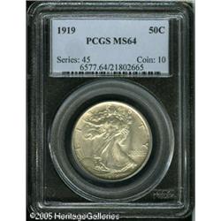 <B>1919 50C MS64 PCGS.</B></I> Very well struck with an appealing, satiny finish and hints of delicate golden color at the margins. Only a few pinpoint marks on the central devices separate this scarcer issue from Gem status. Among Philadelphia Mint issues, only the 1916 and 1921 possess lower productions than the 1919, of which 962,000 pieces were struck.<BR><I>From The William & Harrison Hiatt Registry Collection, Part Two.</B></I> Lot:7961