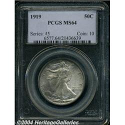 <B>1919<50C> MS64 PCGS.</B></I> Booming cartwheel luster readily penetrates the rich original blanket of variegated silver-gray and russet patina. A crisply struck and well preserved near-Gem, a mint-made hairline-thin diagonal toning streak on the reverse is only perceptible under a glass. Among Philadelphia Mint issues, only the 1916 and 1921 possess lower productions than the 1919, of which 962,000 pieces were struck. <BR><BR><B>Important notice:</B> Heritage usually auctions material at the rate of 200-250 lots per hour. On some occasions eBay Live bid software or the Internet may not be able to keep up with the pace of the auction. We recommend placing a realistic absentee bid now as insurance to avoid disappointment. Occasionally the auctioneer may eliminate or reject an eBay Live bid, and the auctioneer may also reopen a lot after the close of the eBay live bidding (usually because we missed an audience bid), and may reject your bid even if it shows you as the winning bidder. By bidding via eBay Live, you agree that Heritage may award the lot to another bidder at its sole discretion under the circumstances described above or any other reasonable circumstances. Since eBay bids are not shown to us until we open the lot on the floor, we treat those bids just like floor bids. In most cases the floor responds before the eBay bid is presented to us, due to Internet lag time, so for consistency we have made it a policy that floor bids are always considered first over tie eBay live bids. Also please note that all Heritage lots purchased through eBay Live carry a 20% Buyer's Premium. Please make sure you read the Terms and Conditions before you bid. </span></font></tr></table></td></tr></table>