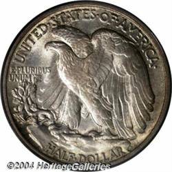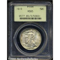 <B>1919<50C> MS65 PCGS.</B></I> While overshadowed by the D and S-mints of this year, the 1919-P is, nevertheless, a very scarce and valuable coin in MS65 or better condition. It is one of the most challenging issues in the series in well struck Gem condition. This piece is just that. Sharply struck in all areas, the surfaces are undeniably original with a touch of original toning, pale gray in the centers and surrounded at the margins by rich antique-golden color. The surfaces are very nearly perfect, the only abrasions we see are a couple of tiny nicks on Liberty's thigh. Outstanding quality and sure to be of great interest to collectors of this always-popular series. Population: 40 in 65, 21 finer (7/04).<BR><I>From The Dr. Frank Lanza Collection of Walking Liberty Half Dollars.</B></I> <BR><BR><B>Important notice:</B> Heritage usually auctions material at the rate of 200-250 lots per hour. On some occasions eBay Live bid software or the Internet may not be able to keep up with the pace of the auction. We recommend placing a realistic absentee bid now as insurance to avoid disappointment. Occasionally the auctioneer may eliminate or reject an eBay Live bid, and the auctioneer may also reopen a lot after the close of the eBay live bidding (usually because we missed an audience bid), and may reject your bid even if it shows you as the winning bidder. By bidding via eBay Live, you agree that Heritage may award the lot to another bidder at its sole discretion under the circumstances described above or any other reasonable circumstances. Since eBay bids are not shown to us until we open the lot on the floor, we treat those bids just like floor bids. In most cases the floor responds before the eBay bid is presented to us, due to Internet lag time, so for consistency we have made it a policy that floor bids are always considered first over tie eBay live bids. Also please note that all Heritage lots purchased through eBay Live carry a 20% Buyer's Premium. Please make sure you read the Terms and Conditions before you bid. </span></font></tr></table></td></tr></table>
