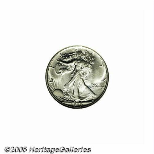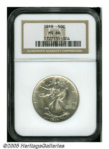 <B>1919<50C> MS66 NGC.</B></I> Extensive die polishing lines in the fields on both sides impart a prooflike appearance to this magnificent Premium Gem example. It is extremely unusual to find an example with reflective luster on both sides. This is an outstanding example with a strong strike including full thumb details on the obverse. This date is one of just nine issues in the series with mintages below 1 million coins. The surfaces are fully brilliant without any evidence of toning on either side. This is tied for finest ever to be certified by NGC. Population: 11 in 66, 0 finer (6/05).<BR><I>From The Robert Moreno Collection.</B></I>