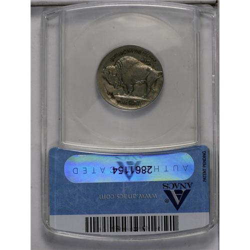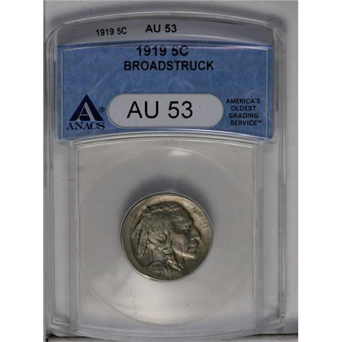 <B>1919<5C> Buffalo Nickel--Broadstruck--AU53 ANACS.</B></I> An off-center broadstrike toward 3 o'clock. Medium gray surfaces retain some luster. As usual, the design elements are sharply detailed, although worn in spots. Minor reverse damage appears to be the result of a counting or wrapping machine that was clogged by this coin.