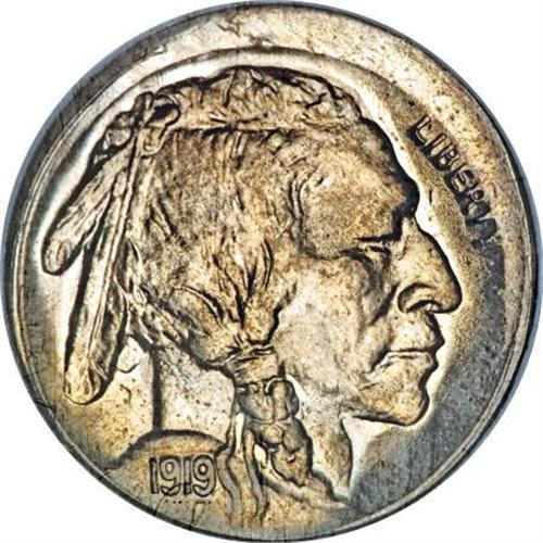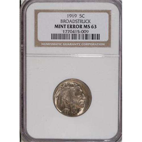 <B>1919 Buffalo Nickel--Broadstruck--MS63 NGC.</B></I> Uncentered toward 7:30, with a broad area of unstruck flan near 1:30. The major devices are unusually sharp, since the dies were able to approach without interference from the absent collar die. The curve of the tail, AMERICA, and LIBERTY are distorted toward the rim, as expected for the error. Light tan-gray toning confirms the originality.<BR><BR><B>Coin Engraver:</B> James E. Fraser<BR><BR><b>Shipping:</b> Coins & Currency (<a target="_blank" href="http://www.heritageauctions.com/common/shipping.php">view shipping information</a>)