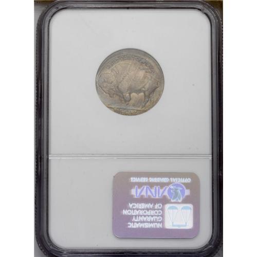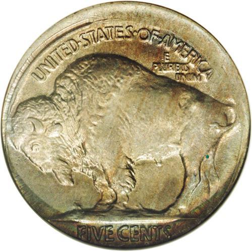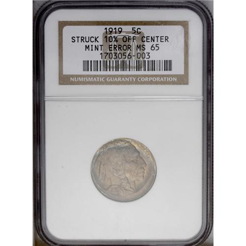 <B>1919<5C> Buffalo Nickel--Struck 10% Off Center--MS65 NGC.</B></I> Struck slightly off center toward 11 o'clock. Legends and designs are intact, but a broad area of unstruck surface is noted at 5 o'clock. This well struck and lustrous Gem is richly patinated in orange, mauve, powder-blue, and lime colors.