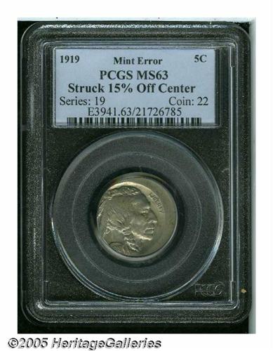 <B>1919<5C> Buffalo Nickel--Struck 15% Off Center--MS63 PCGS.</B></I> Struck off center toward 8 o'clock, most of the date is present although the majority of UNITED is off the flan. A satiny dove-gray and honey-brown piece that has no relevant marks. Clashmarks are noted beneath the Indian's chin.<BR><I>From The Larry Rausch Collection of Errors, Part Four.</B></I>