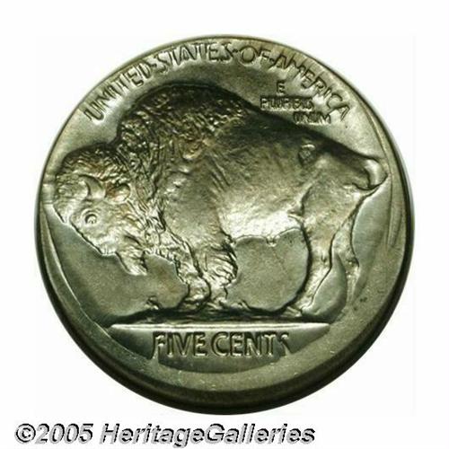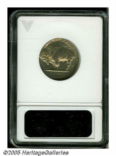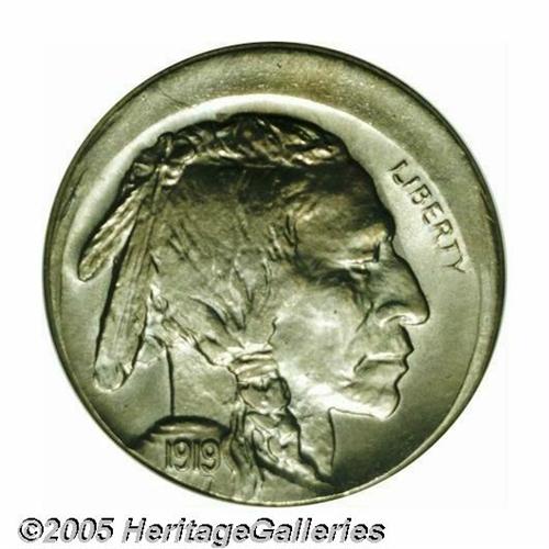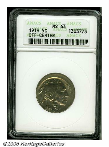<B>1919<5C> Buffalo Nickel--Struck Off Center--MS63 ANACS.</B></I> Struck a couple of degrees off center toward 7 o'clock, the piece somewhat resembles an uncentered broadstrike with a broad area of unstruck surface widest at 1 o'clock. Intricately struck on the centers, the legends are distorted from unrestrained metal flow to the borders. Lustrous, unmarked, and lightly toned in tan and lilac-rose hues.