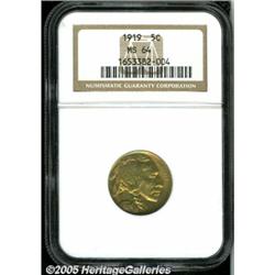 <B>1919 5C MS64 NGC.</B></I> Softly struck on the bison's head, with satin luster, lovely lime-green toning in the centers, and iridescent bright-green and pink coloration near the peripheries. Just a couple of minor contact marks are found overall.